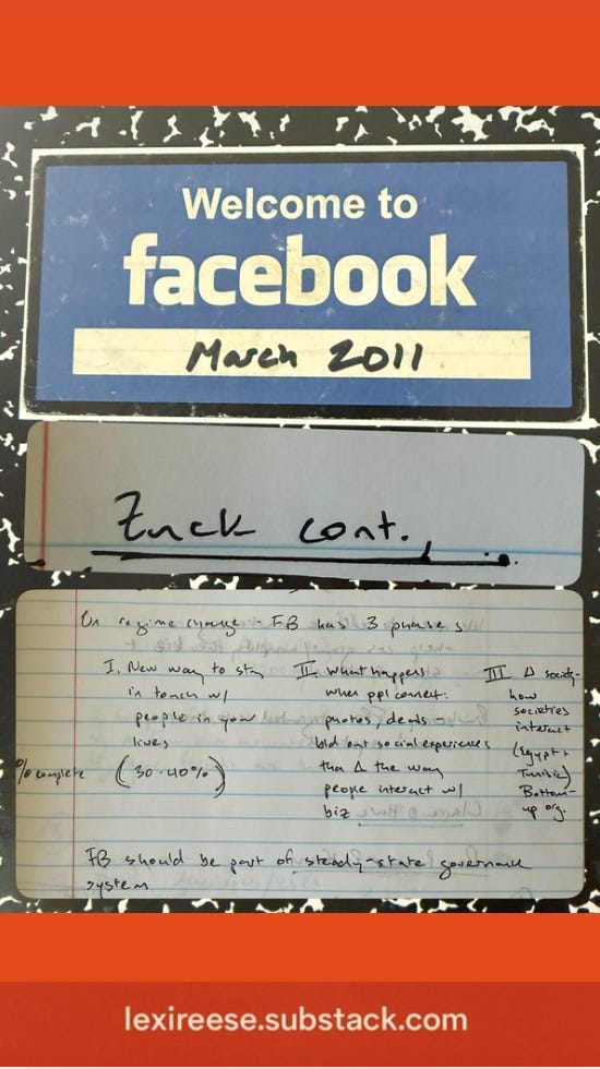 There's a moment in spring 2011 that I keep returning to. I'm sitting in a Facebook conference room with 29 other new hires, many poached from Google where I had come from, listening to Mark Zuckerberg explain how we're about to remake human civilization.
