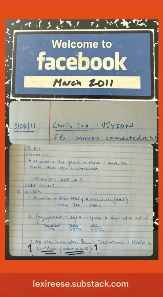 The goals were breathtaking in their scope: get people to spend 6 out of 7 days on Facebook. Expand to children under 13 (yes - for real). Double revenue to $3.2 billion in six months.¹